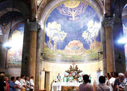| ▲ 예수님께서 피땀 흘리며 기도하신 바위가 있는 ‘겟세마니 성당’에서 미사가 거행되고 있다. |