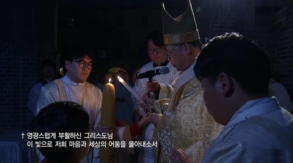 서울대교구장 정순택 대주교가 4일 파스카 성야 미사에서 부활초에 불을 붙이고 있다. CPBC 생중계 캡쳐