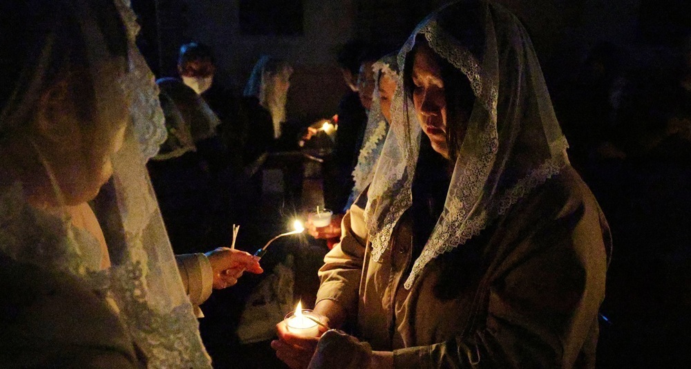 신자들의 손에서 손으로 전해진 빛은 성당 가득 번지며 어둠을 밀어냅니다.