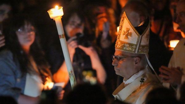 레오 14세 교황이 2026년 4월 4일 바티칸 성 베드로 대성전에서 파스카 성야 미사를 집전하기 위해 도착하면서 촛불을 들고 있다. OSV